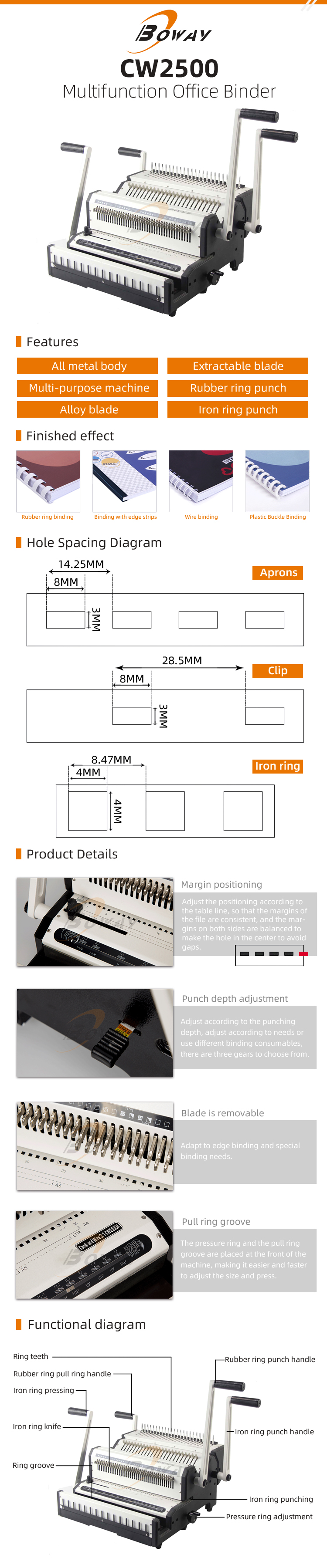 {"type":"2","json":[{"index":"0","tran_value":["CW2500"],"tran_label":"Model"},{"index":"1","tran_label":"Punching method","tran_value":["Manual"]},{"index":"2","tran_label":"Punch thickness","tran_value":["25 sheets"]},{"index":"3","tran_label":"Binding thickness","tran_value":["Iron ring: 125 sheets/Rubber ring: 500 sheets of paper"]},{"index":"4","tran_label":"Consumables","tran_value":["Iron ring/apron/clamp/plastic buckle"]},{"index":"5","tran_label":"Depth adjustment","tran_value":["2.5mm/4.5mm/6.5mm"]},{"index":"6","tran_label":"Margin adjustment","tran_value":["Yes"]},{"index":"7","tran_label":"Size","tran_value":["540x475x272mm"]},{"index":"8","tran_label":"Weight","tran_value":["28.5kg"]}]}