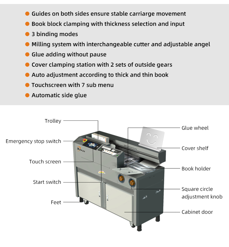 {"type":"2","json":[{"index":"0","tran_value":["K5A"],"tran_label":"Model"},{"index":"1","tran_label":"Max length(mm)","tran_value":["335"]},{"index":"2","tran_label":"Max thickness(mm)","tran_value":["60"]},{"index":"3","tran_label":"Speed(book/hr)","tran_value":["200-350"]},{"index":"4","tran_label":"Warming up(min)","tran_value":["35"]},{"index":"5","tran_label":"Milling deepth swift","tran_value":["0.5mm/0.75mm/1mm"]},{"index":"6","tran_label":"Spine Gluing rooler","tran_value":["1"]},{"index":"7","tran_label":"Side gluing","tran_value":["√"]},{"index":"8","tran_label":"Dust collecting method","tran_value":["Singlefan"]},{"index":"9","tran_label":"Grinding roller adjustment","tran_value":["/"]},{"index":"10","tran_label":"Grinding roller inde temp","tran_value":["/"]},{"index":"11","tran_label":"Voltage","tran_value":["220V(110V)±10%50Hz(60Hz)"]},{"index":"12","tran_label":"Power(w)","tran_value":["2200"]},{"index":"13","tran_label":"Size(mm)","tran_value":["1300*670*1080"]},{"index":"14","tran_label":"N.W.(kg)","tran_value":["220"]}]}
